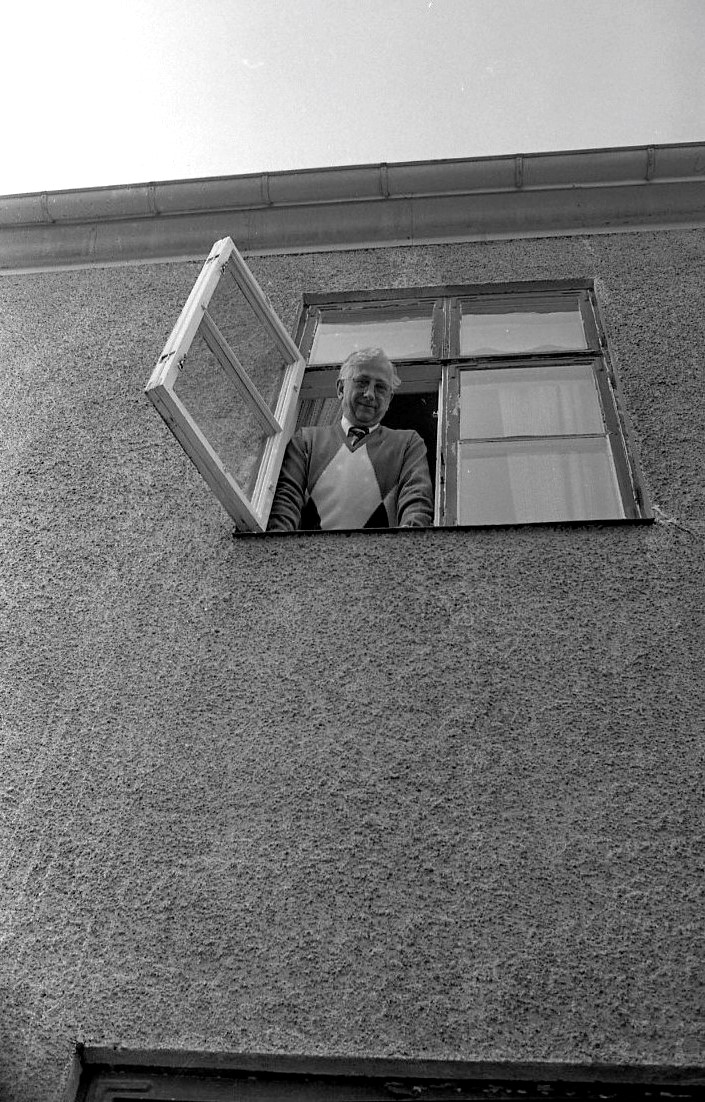 Hans Hjelte blickar ner på Stora Bergsgatan från sitt kontor i Ahnerska